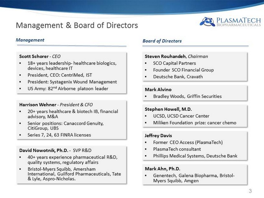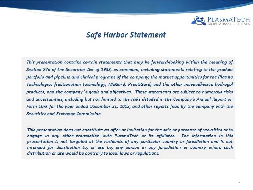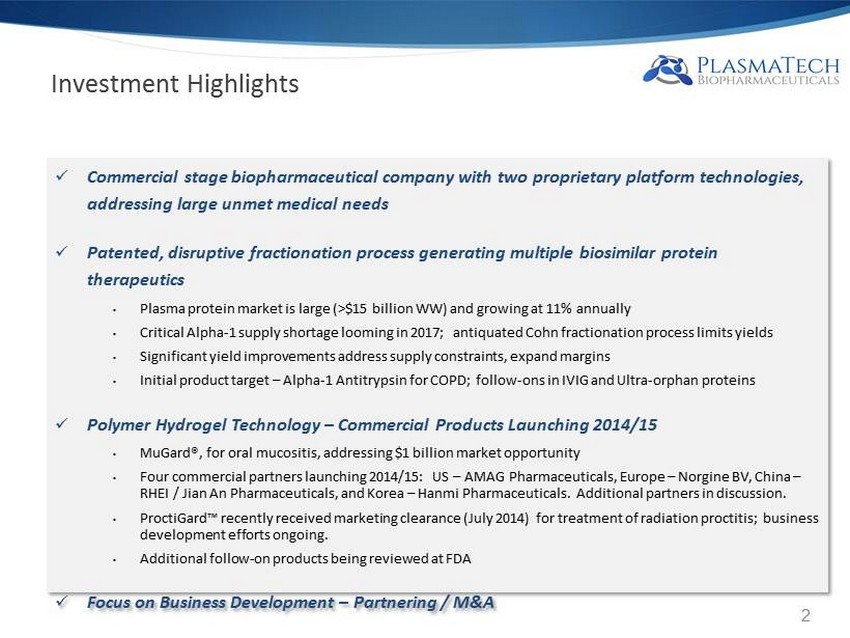 This presentation contains certain statements that may be forward - looking within the meaning of Section 27 a of the Securities Act of 1933 , as amended, including statements relating to the product portfolio and pipeline and clinical programs of the company, the market opportunities for the Plasma Technologies fractionation technology, MuGard, ProctiGard, and the other mucoadhesive hydrogel products, and the company ’ s goals and objectives . These statements are subject to numerous risks and uncertainties, including but not limited to the risks detailed in the Company’s Annual Report on Form 10 - K for the year ended December 31 , 2013 , and other reports filed by the company with the Securities and Exchange Commission . This presentation does not constitute an offer or invitation for the sale or purchase of securities or to engage in any other transaction with PlasmaTech or its affiliates . The information in this presentation is not targeted at the residents of any particular country or jurisdiction and is not intended for distribution to, or use by, any person in any jurisdiction or country where such distribution or use would be contrary to local laws or regulations . 1 Safe Harbor Statement