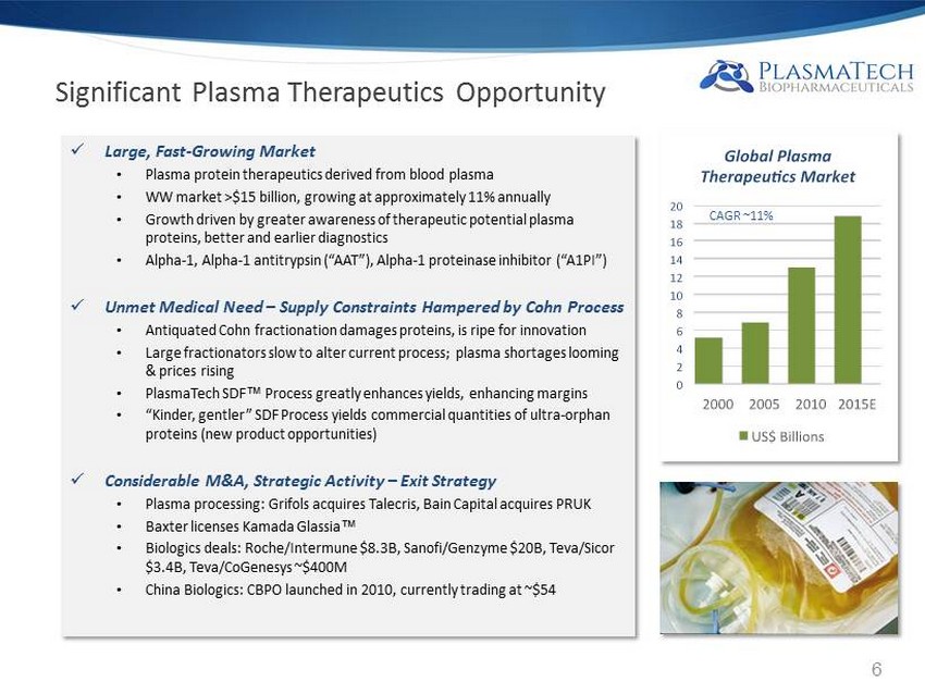 SDF Process: Salt Diafiltration Process Complete 2014 2015 2017 SDF Alpha™ (Alpha-1) Process Scale UpRegulatory > $ 2.5B SDF Gamma™ (IVIG) Process Scale UpRegulatory > $11.5B PlasmaTech™ Ultra-Orphan Discovery TBD TBD > $ 1B Plasma Protein Addressable Markets ~ $15B MuGard ® 510(k) Europe: Norgine, Korea: Hanmi > $1B US: AMAG, China: RHEI ProctiGard™ 510(k) Commercial > $500M BenzaGard™ > $500M Oncology Supportive Care Markets > $2B ongoing global commercial optimization FDA Discussions towards 510(k) Process validation, Patent PTBI License, Manufacturer Qualification 2016 Commercial Commercial Commercial PHT: Polymer Hydrogel Technology Platform 2015 Market Opportunity 2017 Market Opportunity Product Pipeline Targeting > $17B Market Opportunity over next 3 years 5