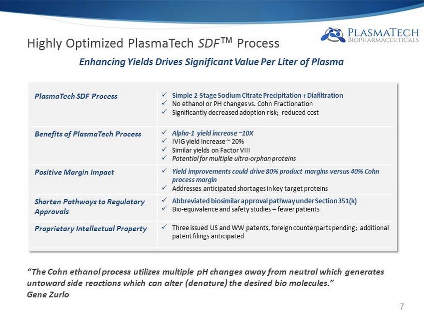 Significant Plasma Therapeutics Opportunity x Large, Fast - Growing Market • Plasma protein therapeutics derived from blood plasma • WW market >$15 billion, growing at approximately 11% annually • Growth driven by greater awareness of therapeutic potential plasma proteins, better and earlier diagnostics • Alpha - 1, Alpha - 1 antitrypsin (“AAT”), Alpha - 1 proteinase inhibitor (“A1PI”) x Unmet Medical Need – Supply Constraints Hampered by Cohn Process • Antiquated Cohn fractionation damages proteins, is ripe for innovation • Large fractionators slow to alter current process; plasma shortages looming & prices rising • PlasmaTech SDF ™ Process greatly enhances yields, enhancing margins • “Kinder, gentler” SDF Process yields commercial quantities of ultra - orphan proteins (new product opportunities) x Considerable M&A, Strategic Activity – Exit Strategy • Plasma processing: Grifols acquires Talecris, Bain Capital acquires PRUK • Baxter licenses Kamada Glassia ™ • Biologics deals: Roche/Intermune $8.3B, Sanofi/Genzyme $20B, Teva/Sicor $3.4B, Teva/CoGenesys ~$400M • China Biologics: CBPO launched in 2010, currently trading at ~$54 CAGR ~11% 6