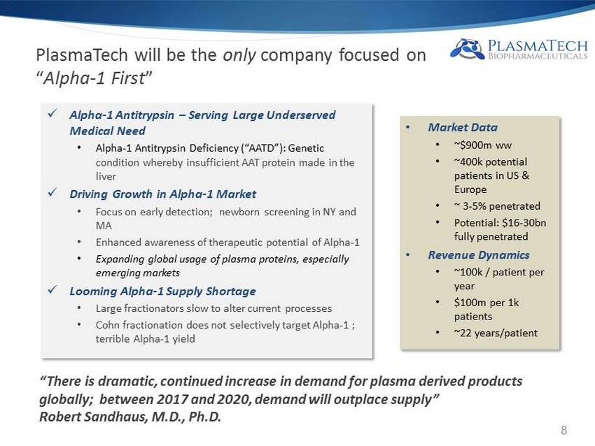 Highly Optimized PlasmaTech SDF ™ Process PlasmaTech SDF Process x Simple 2 - Stage Sodium Citrate Precipitation + Diafiltration x No ethanol or PH changes vs. Cohn Fractionation x Significantly decreased adoption risk; reduced cost Benefits of PlasmaTech Process x Alpha - 1 yield increase ~10X x IVIG yield increase ~ 20% x Similar yields on Factor VIII x Potential for multiple ultra - orphan proteins Positive Margin Impact x Yield improvements could drive 80% product margins versus 40% Cohn process margin x Addresses anticipated shortages in key target proteins Shorten Pathways to Regulatory Approvals x Abbreviated biosimilar approval pathway under Section 351(k) x Bio - equivalence and safety studies – fewer patients Proprietary Intellectual Property x Three issued US and WW patents, foreign counterparts pending; additional patent filings anticipated Enhancing Yields Drives Significant Value Per Liter of Plasma “The Cohn ethanol process utilizes multiple pH changes away from neutral which generates untoward side reactions which can alter (denature) the desired bio molecules.” Gene Zurlo 7