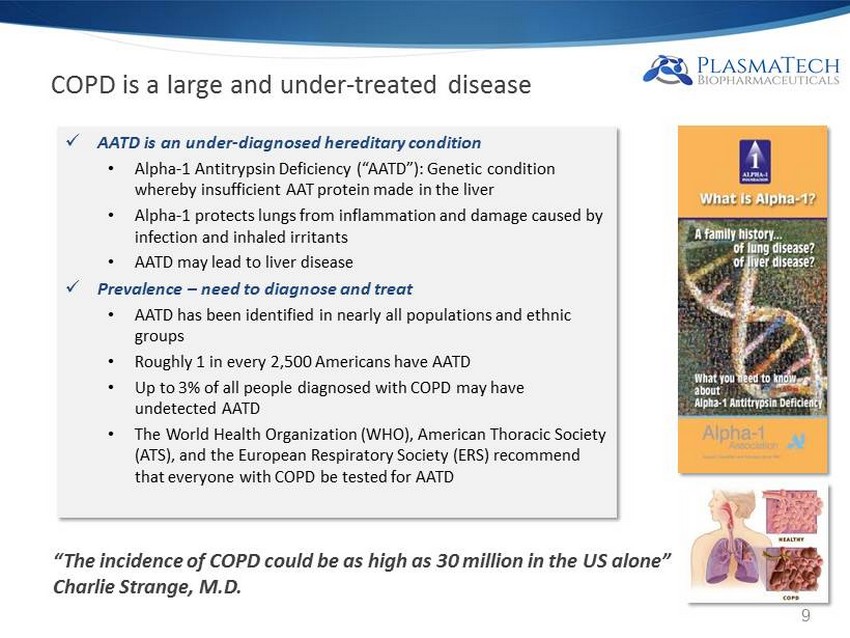 PlasmaTech will be the only company focused on “ Alpha - 1 First ” x Alpha - 1 Antitrypsin – Serving Large Underserved Medical Need • Alpha - 1 Antitrypsin Deficiency (“AATD”): Genetic condition whereby insufficient AAT protein made in the liver x Driving Growth in Alpha - 1 Market • Focus on early detection; newborn screening in NY and MA • Enhanced awareness of therapeutic potential of Alpha - 1 • Expanding global usage of plasma proteins, especially emerging markets x Looming Alpha - 1 Supply Shortage • Large fractionators slow to alter current processes • Cohn fractionation does not selectively target Alpha - 1 ; terrible Alpha - 1 yield “There is dramatic, continued increase in demand for plasma derived products globally; between 2017 and 2020, demand will outplace supply” Robert Sandhaus, M.D., Ph.D. • Market Data • ~$900m ww • ~400k potential patients in US & Europe • ~ 3 - 5% penetrated • Potential: $16 - 30bn fully penetrated • Revenue Dynamics • ~100k / patient per year • $100m per 1k patients • ~22 years/patient 8
