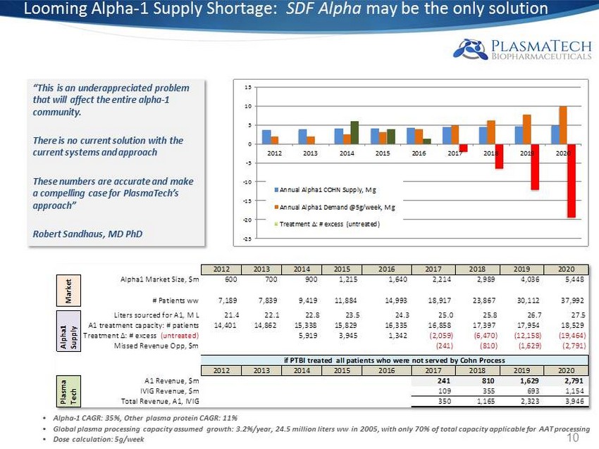 Looming Alpha - 1 Supply Shortage: SDF Alpha may be the only solution 10 • Alpha - 1 CAGR: 35%, Other plasma protein CAGR: 11% • Global plasma processing capacity assumed growth: 3.2%/year, 24.5 million liters ww in 2005, with only 70% of total capacity app licable for AAT processing • Dose calculation: 5g/week “This is an underappreciated problem that will affect the entire alpha - 1 community. There is no current solution with the current systems and approach These numbers are accurate and make a compelling case for PlasmaTech’s approach” Robert Sandhaus, MD PhD Alpha1 Market Size, $m M a r k e t 2012 2013 2014 2015 2016 2017 2018 2019 2020 600 700 900 1,215 1,640 2,214 2,989 4,036 5,448 # Patients ww M a r k e t 7,189 7,839 9,419 11,884 14,993 18,917 23,867 30,112 37,992 Liters sourced for A1, M L A l p h a 1 S u p p l y 21.4 22.1 22.8 23.5 24.3 25.0 25.8 26.7 27.5 A1 treatment capacity: # patients Treatment Δ: # excess (untreated) Missed Revenue Opp, $m if PTBI treated all patients who were not served by Cohn Process A l p h a 1 S u p p l y P l a s m a T e c h 14,401 14,862 15,338 15,829 16,335 16,858 17,397 17,954 18,529 5,919 3,945 1,342 (2,059) (6,470) (12,158) (19,464) (241) (810) (1,629) (2,791) 2012 2013 2014 2015 2016 2017 2018 2019 2020 if PTBI treated all patients who were not served by Cohn Process A1 Revenue, $m IVIG Revenue, $m Total Revenue, A1, IVIG P l a s m a T e c h 241 810 1,629 2,791 109 355 693 1,154 350 1,165 2,323 3,946 -25 -20 -15 -10 -5 0 5 10 15 2012 2013 2014 2015 2016 2017 2018 2019 2020 Annual Alpha1 COHN Supply, M g Annual Alpha1 Demand @5g/week, M g Treatment Δ: # excess (untreated)