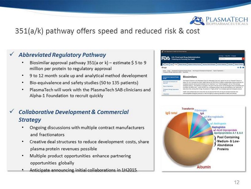 351(a/k) pathway offers speed and reduced risk & cost x Abbreviated Regulatory Pathway • Biosimilar approval pathway 351(a or k) – estimate $ 5 to 9 million per protein to regulatory approval • 9 to 12 month scale up and analytical method development • Bio - equivalence and safety studies (50 to 135 patients) • PlasmaTech will work with the PlasmaTech SAB clinicians and Alpha - 1 Foundation to recruit quickly x Collaborative Development & Commercial Strategy • Ongoing discussions with multiple contract manufacturers and fractionators • Creative deal structures to reduce development costs, share plasma protein revenues possible • Multiple product opportunities enhance partnering opportunities globally • Anticipate announcing initial collaborations in 1H2015 12