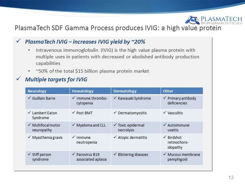 PlasmaTech SDF Gamma Process produces IVIG: a high value protein x PlasmaTech IVIG – increases IVIG yield by ~20% • Intravenous immunoglobulin (IVIG) is the high value plasma protein with multiple uses in patients with decreased or abolished antibody production capabilities • ~50% of the total $15 billion plasma protein market x Multiple targets for IVIG Neurology Hematology Dermatology Other x Guillain Barre x Immune thrombo - cytopenia x Kawasaki Syndrome x Primary antibody deficiencies x Lambert Eaton Syndrome x Post BMT x Dermatomyositis x Vasculitis x Multifocal motor neuropathy x Myeloma and CLL x Toxic epidermal necrolysis x Autoimmune uveitis x Myasthenia gravis x Immune neutropenia x Atopic dermatitis x Birdshot retinochoro - idopathy x Stiff person syndrome x Parovirus B19 associated aplasia x Blistering diseases x Mucous membrane pemphigoid 13