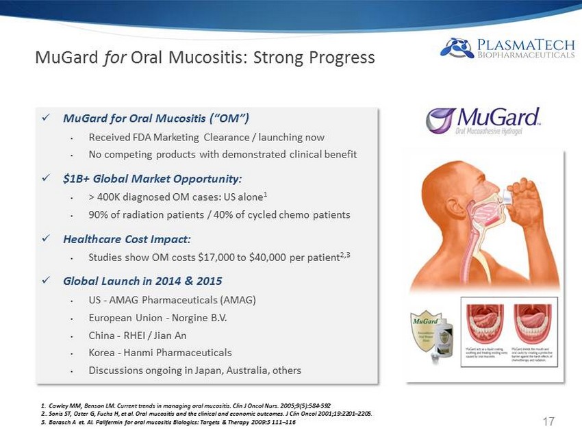 Significant Medical Issue Often Unrecognized, Undiagnosed and Undertreated Well - Being x Pain x Problems with eating, drinking, speaking and swallowing x Weight loss x Impairment of quality of life (e.g. mood) Infection x Reduces infection barrier Compromised Treatment x Reduced dosage x Breaks or delays in therapy affecting treatment outcomes Economic Impact x Prolonged hospital stays x Increased use of resources (e.g. feeding tube placement) The MuGard Patient Solution x User - friendly ready to use rinse x Reduces pain x Improves speech MuGard for Oral Mucositis: unique and differentiated 16
