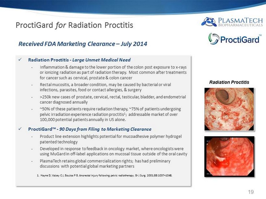 x Protocol – Multi - center, randomized, placebo controlled study in 120 head and neck cancer patients x Positive - MuGard was statistically significant with regard to : • Primary endpoint of reduction in mouth and throat soreness ( p= 0 . 034 ) • Reduction in OM disease severity by WHO score at end of radiation treatment (p= 0 . 038 ) x Secondary Endpoints – Clinically important trends for MuGard • 10 . 0 day decrease in opioid use ; duration of opioid use < 50 % less in MuGard arm • MuGard patient weight loss 3 . 9 kg less • Delayed onset of oral mucositis by 9 days • Overall MuGard very well tolerated with no SAEs x First trial to show clinical benefit in oral mucositis for tough - to - treat head and neck cancer patients . Published in CANCER – May 1, 2014 x Novartis’ Afinitor (everolimus), approved in various breast, pancreatic, renal and brain cancers x Approximately 70% of Afinitor patients experience severe (painful, ulcerative) stomatitis that presents like oral mucositis x Initiated by UCLA breast cancer clinician who have had success with MuGard in Afinitor patients experiencing OM; trial supported by Novartis, PlasmaTech, and AMAG x Afinitor’s approval in breast cancer should drive revenues by an additional $1.5 billion (analyst estimates for 2018 exceed $3.5 billion); reducing mucositis side effect could be an important value driver Novartis / UCLA MuGard Trial Mucoadhesive Oral Wound Rinse (MuGard) in Preventing and Treating Stomatitis in Patients with ER - or PR - Positive Breast Cancer Receiving Everolimus 18