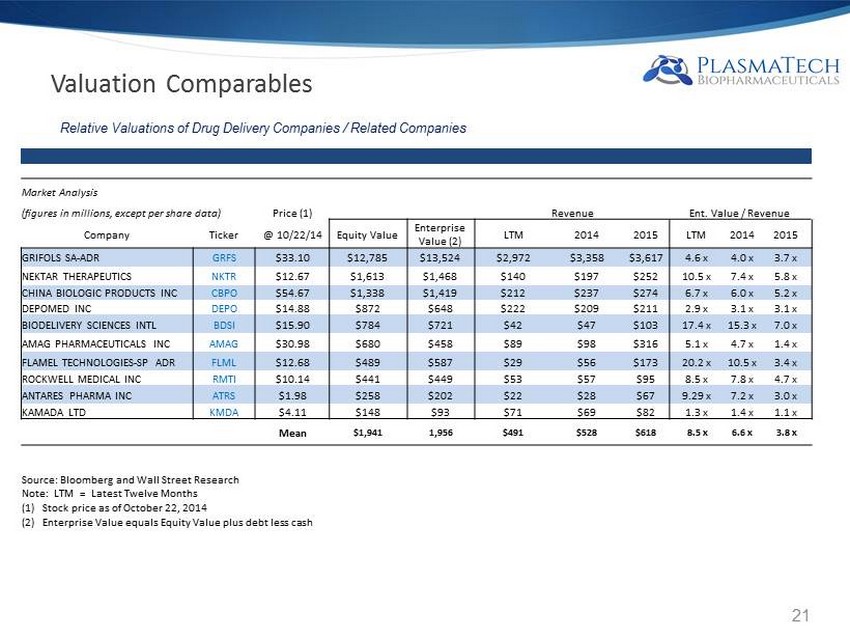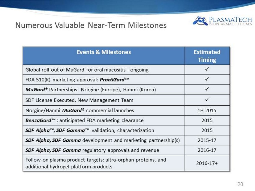 Numerous Valuable Near - Term Milestones Events & Milestones Estimated Timing Global roll - out of MuGard for oral mucositis - ongoing x FDA 510(K) marketing approval: ProctiGard™ x MuGard ® Partnerships: Norgine ( Europe), Hanmi (Korea) x SDF License Executed, New Management Team x Norgine/Hanmi MuGard ® commercial launches 1H 2015 BenzaGard™ : anticipated FDA marketing clearance 2015 SDF Alpha™, SDF Gamma™ validation, characterization 2015 SDF Alpha, SDF Gamma development and marketing partnership(s) 2015 - 17 SDF Alpha, SDF Gamma regulatory approvals and revenue 2016 - 17 Follow - on plasma product targets: ultra - orphan proteins, and additional hydrogel platform products 2016 - 17+ 20