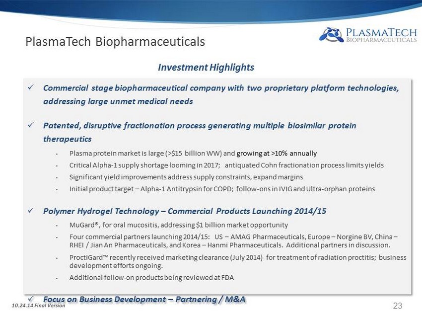 x Commercial stage biopharmaceutical company with two proprietary platform technologies, addressing large unmet medical needs x Patented, disruptive fractionation process generating multiple biosimilar protein therapeutics • Plasma protein market is large (>$15 billion WW) and growing at >10% annually • Critical Alpha - 1 supply shortage looming in 2017; antiquated Cohn fractionation process limits yields • Significant yield improvements address supply constraints, expand margins • Initial product target – Alpha - 1 Antitrypsin for COPD; follow - ons in IVIG and Ultra - orphan proteins x Polymer Hydrogel Technology – Commercial Products Launching 2014/15 • MuGard®, for oral mucositis, addressing $1 billion market opportunity • Four commercial partners launching 2014/15: US – AMAG Pharmaceuticals, Europe – Norgine BV, China – RHEI / Jian An Pharmaceuticals, and Korea – Hanmi Pharmaceuticals. Additional partners in discussion. • ProctiGard™ recently received marketing clearance (July 2014) for treatment of radiation proctitis; business development efforts ongoing. • Additional follow - on products being reviewed at FDA x Focus on Business Development – Partnering / M&A Investment Highlights PlasmaTech Biopharmaceuticals 10.24.14 Final Version 23