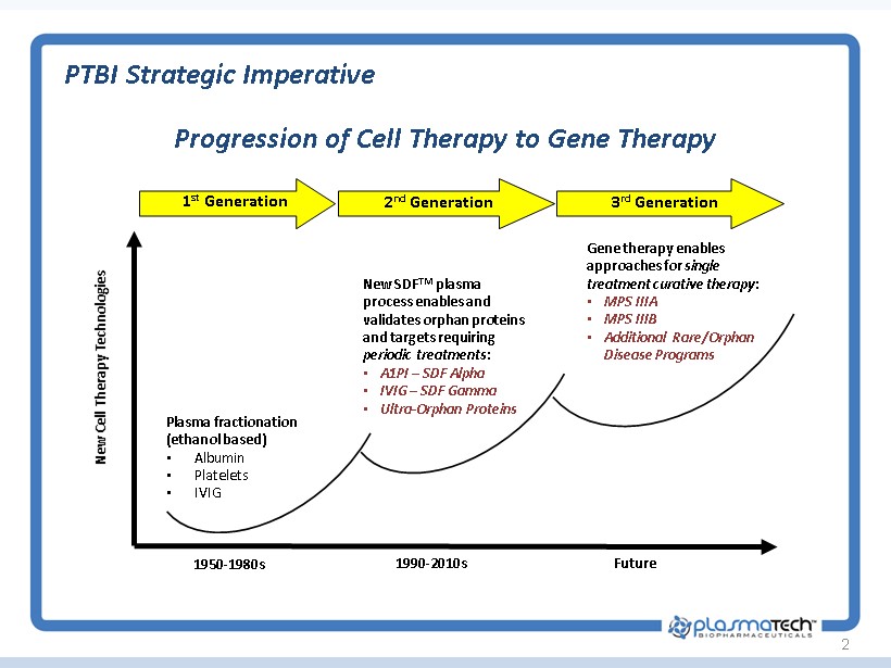 This presentation contains certain statements that may be forward - looking within the meaning of Section 27 a of the Securities Act of 1933 , as amended, including statements relating to the product portfolio and pipeline and clinical programs of the company, the market opportunities for the Plasma Technologies fractionation technology, MuGard, ProctiGard, and the other mucoadhesive hydrogel products, and the company ’ s goals and objectives . These statements are subject to numerous risks and uncertainties, including but not limited to the risks detailed in the Company’s Annual Report on Form 10 - K for the year ended December 31 , 2014 , and other reports filed by the company with the Securities and Exchange Commission . This presentation does not constitute an offer or invitation for the sale or purchase of securities or to engage in any other transaction with PlasmaTech or its affiliates . The information in this presentation is not targeted at the residents of any particular country or jurisdiction and is not intended for distribution to, or use by, any person in any jurisdiction or country where such distribution or use would be contrary to local laws or regulations . 1 Safe Harbor Statement