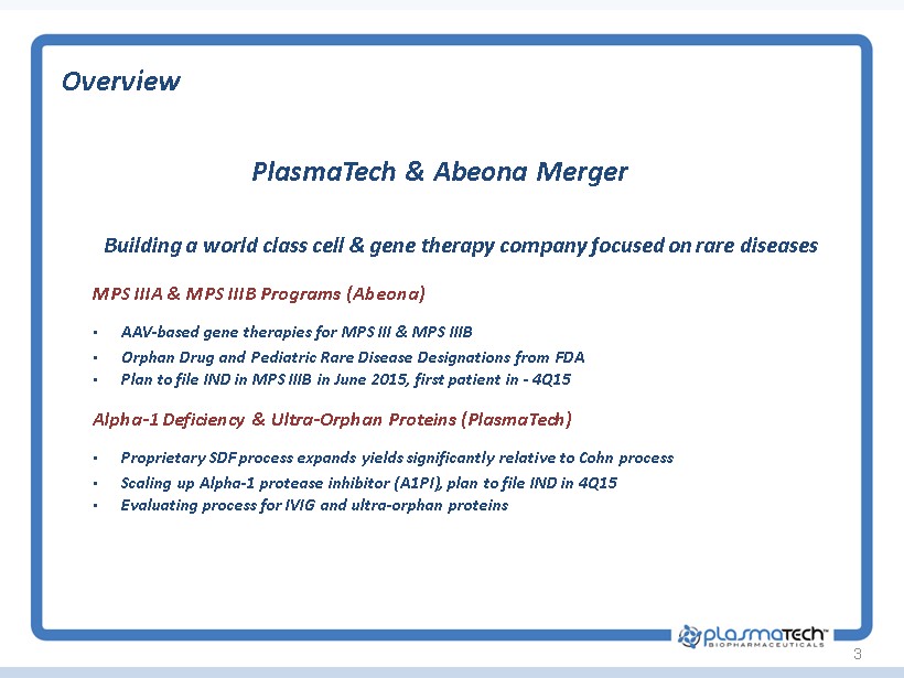2 1 st Generation 2 nd Generation 3 rd Generation Plasma fractionation (ethanol based) • Albumin • Platelets • IVIG New Cell Therapy Technologies 1950 - 1980s New SDF ™ plasma process enables and validates orphan proteins and targets requiring periodic treatments : • A1PI – SDF Alpha • IVIG – SDF Gamma • Ultra - Orphan Proteins 1990 - 2010s Gene therapy enables approaches for single treatment curative therapy : • MPS IIIA • MPS IIIB • Additional Rare/Orphan Disease Programs Future PTBI Strategic Imperative Progression of Cell Therapy to Gene Therapy