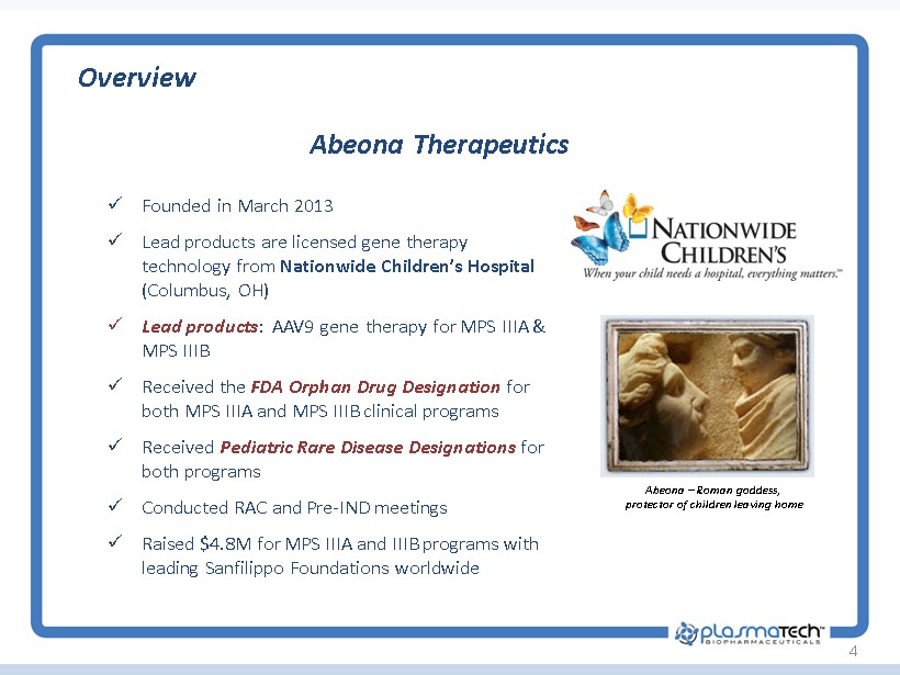 3 PlasmaTech & Abeona Merger Building a world class cell & gene therapy company focused on rare diseases MPS IIIA & MPS IIIB Programs ( Abeona ) • AAV - based gene therapies for MPS III & MPS IIIB • Orphan Drug and Pediatric Rare Disease Designations from FDA • Plan to file IND in MPS IIIB in June 2015, first patient in - 4Q15 Alpha - 1 Deficiency & Ultra - Orphan Proteins ( PlasmaTech ) • Proprietary SDF process expands yields significantly relative to Cohn process • Scaling up Alpha - 1 protease inhibitor (A1PI), plan to file IND in 4Q15 • Evaluating process for IVIG and ultra - orphan proteins Overview