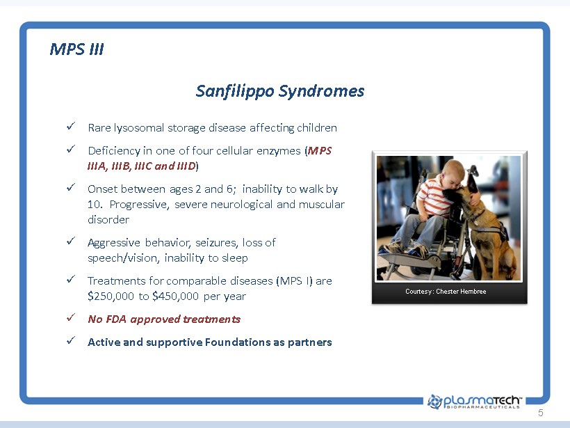4 Abeona Therapeutics Overview Abeona – Roman goddess, protector of children leaving home x Founded in March 2013 x Lead products are licensed gene therapy technology from Nationwide Children’s Hospital (Columbus, OH) x Lead products : AAV9 gene therapy for MPS IIIA & MPS IIIB x Received the FDA Orphan Drug Designation for both MPS IIIA and MPS IIIB clinical programs x Received Pediatric Rare Disease Designations for both programs x Conducted RAC and Pre - IND meetings x Raised $4.8M for MPS IIIA and IIIB programs with leading Sanfilippo Foundations worldwide