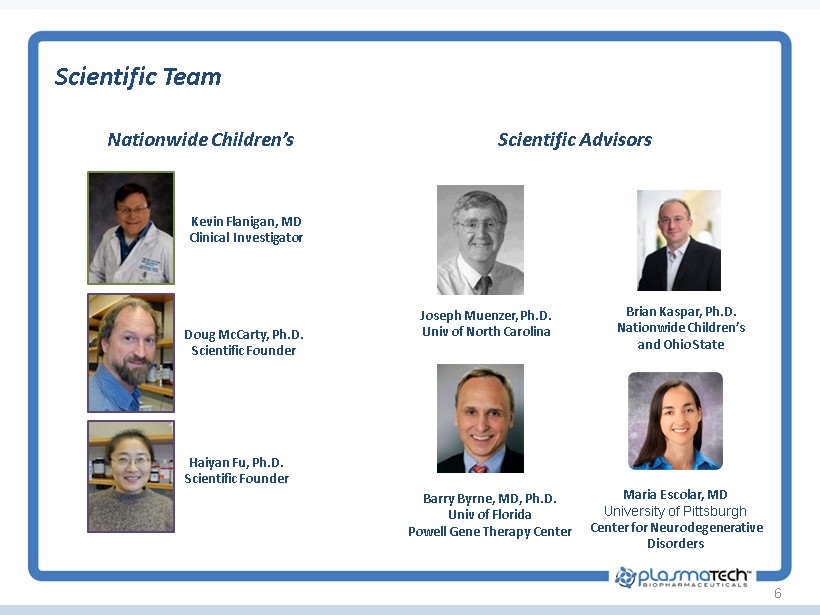 5 Sanfilippo Syndromes MPS III x Rare lysosomal storage disease affecting children x Deficiency in one of four cellular enzymes ( MPS IIIA, IIIB, IIIC and IIID ) x Onset between ages 2 and 6; inability to walk by 10. Progressive, severe neurological and muscular disorder x Aggressive behavior, seizures, loss of speech/vision, inability to sleep x Treatments for comparable diseases (MPS I) are $250,000 to $450,000 per year x No FDA approved treatments x Active and supportive Foundations as partners Courtesy: Chester Hembree
