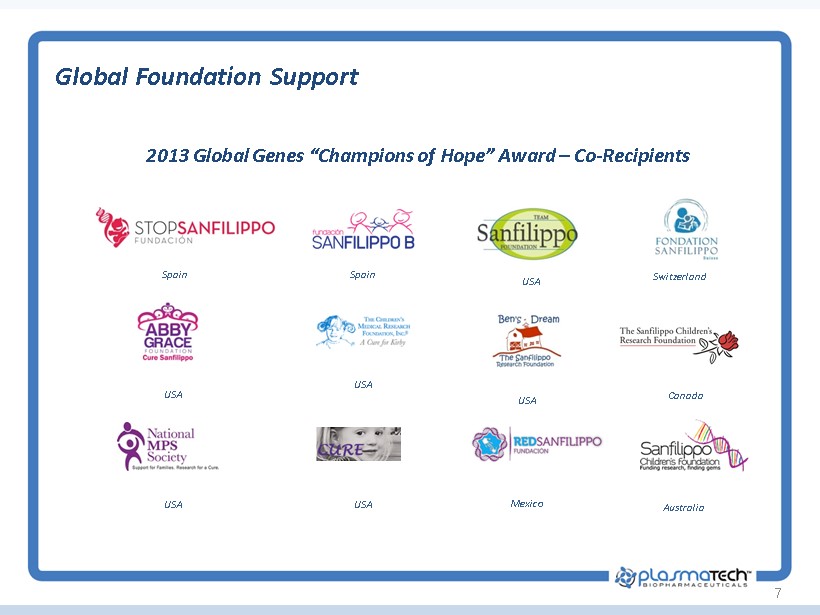 6 Scientific Team Nationwide Children’s Scientific Advisors Kevin Flanigan , MD Clinical Investigator Doug McCarty, Ph.D. Scientific Founder Haiyan Fu, Ph.D. Scientific Founder Joseph Muenzer , Ph.D. Univ of North Carolina Maria Escolar, MD University of Pittsburgh Center for Neurodegenerative Disorders Barry Byrne, MD, Ph.D. Univ of Florida Powell Gene Therapy Center Brian Kaspar , Ph.D. Nationwide Children’s and Ohio State