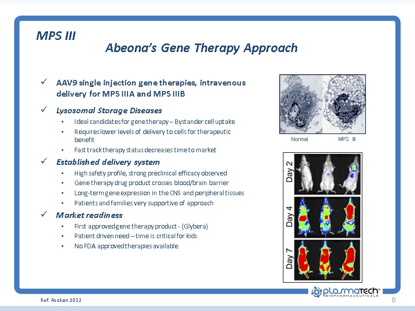 8 Abeona’s Gene Therapy Approach MPS III x AAV9 single injection gene therapies, intravenous delivery for MPS IIIA and MPS IIIB x Lysosomal Storage Diseases • Ideal candidates for gene therapy – Bystander cell uptake • Requires lower levels of delivery to cells for therapeutic benefit • Fast track therapy status decreases time to market x Established delivery system • High safety profile, strong preclinical efficacy observed • Gene therapy drug product crosses blood/brain barrier • Long - term gene expression in the CNS and peripheral tissues • Patients and families very supportive of approach x Market readiness • First approved gene therapy product - ( Glybera ) • Patient driven need – time is critical for kids • No FDA approved therapies available Normal MPS III Ref: Asokan 2012