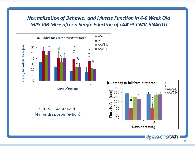 9 Normalization of Behavior and Muscle Function in 4 - 6 Week Old MPS IIIB Mice after a Single Injection of rAAV9 - CMV - hNAGLU 5.0 - 5.5 months old (4 months post - injection) * # # # * * * * * ^ ^ & * & & 0 10 20 30 40 50 60 70 1 2 3 4 Latency to find platform (sec) Days of testing a. Hidden task in Morris water maze +/+ -/- AAV9-L AAV9-H ^ * ^ * # # 0 50 100 150 200 250 300 350 Time to fall (sec) 1 2 Days of testing b. Latency to fall from a rotarod +/+ - / - AAV9 - L AAV9 - H