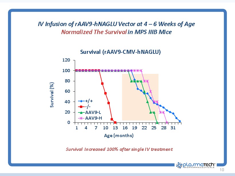 10 IV Infusion of rAAV9 - hNAGLU Vector at 4 – 6 Weeks of Age Normalized The Survival in MPS IIIB Mice 0 20 40 60 80 100 120 1 4 7 10 13 16 19 22 25 28 31 Survival (%) Age (months) Survival (rAAV9 - CMV - hNAGLU) +/+ -/- AAV9-L AAV9-H Survival Increased 100% after single IV treatment