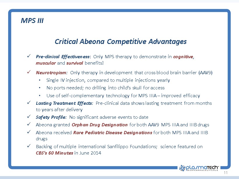 11 Critical Abeona Competitive Advantages MPS III x Pre - clinical Effectiveness : Only MPS therapy to demonstrate in cognitive , muscular and survival benefits! x Neurotropism : Only therapy in development that cross blood brain barrier (AAV9) • Single IV injection, compared to multiple injections yearly • No ports needed; no drilling into child’s skull for access • Use of self - complementary technology for MPS IIIA – improved efficacy x Lasting Treatment Effects: Pre - clinical data shows lasting treatment from months to years after delivery x Safety Profile: No significant adverse events to date x Abeona granted Orphan Drug Designation for both AAV9 MPS IIIA and IIIB drugs x Abeona received Rare Pediatric Disease Designations for both MPS IIIA and IIIB drugs x Backing of multiple international Sanfilippo Foundations; science featured on CBS’s 60 Minutes in June 2014
