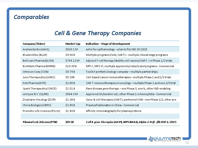 12 Cell & Gene Therapy Companies Comparables Company (Ticker) Market Cap Indication – Stage of Development Avalanche Bio (AAVL) $820.1 M AAVs for opthalmology – plan to file IND 2H 2015 Bluebird Bio (BLUE) $4.56 B Multiple programs ( lenti , CAR T) – multiple clinical stage programs Bellicum Pharma (BLCM) $744.12 M Adjunct T - cell therapy/ dedritic cell vaccine/CAR T – in Phase 1/2 trials BioMarin Pharma (BMRN) $19.39 B MPS I, MPS VI, multiple approved products and programs - Commercial Intrexon Corp (XON) $4.74 B Toolkit synthetic biology company – multiple partnerships Juno Therapeutics (JUNO) $5.24B Cell - based cancer immunotherapies – multiple Phase 1 and 1/2 trials Kite Pharma (KITE) $2.65 B CAR T immunotherapies in oncology – multiple Phase 1 and one 2/3 trial Spark Therapeutics (ONCE) $1.51 B Rare disease gene therapy – one Phase 3, one ½, other IND - enabling uniQure N.V. (QURE) $564.3 M Approved Glybera for LLD, other Phase 1 in hemophilia - Commercial Ziopharm Oncology (ZIOP) $1.38 B Gene & c ell therapies (CAR T), partnered XON – one Phase 1/2, other pre China Biologics (CBPO) $2.45 B Plasma fractionator in China – Commercial Prometic Life Sciences ( PLI.to ) $1.4 0 B Affinity chromatography for plasma proteins PlasmaTech / Abeona (PTBI) $85 M Cell & gene therapies (AAV9, MPS IIIA&B, Alpha - 1 Def ) – file IND 6/2015