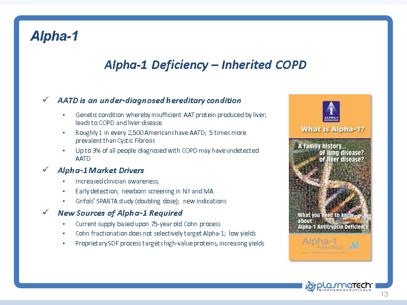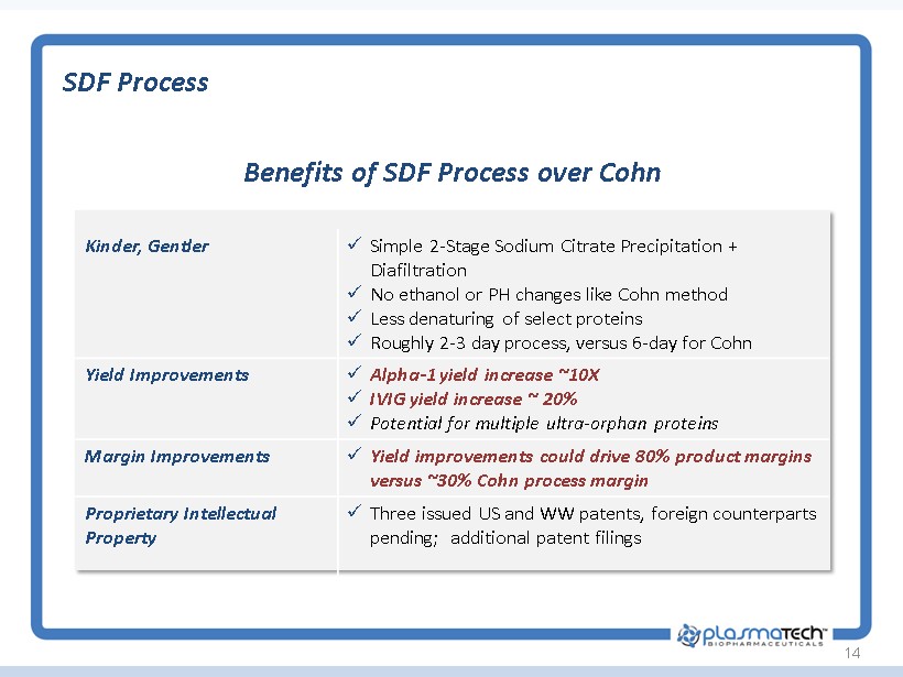 13 Alpha - 1 Deficiency – Inherited COPD Alpha - 1 x AATD is an under - diagnosed hereditary condition • Genetic condition whereby insufficient AAT protein produced by liver; leads to COPD and liver disease • Roughly 1 in every 2,500 Americans have AATD; 5 times more prevalent than Cystic Fibrosis • Up to 3% of all people diagnosed with COPD may have undetected AATD x Alpha - 1 Market Drivers • Increased clinician awareness; • Early detection; newborn screening in NY and MA • Grifols ’ SPARTA study (doubling dose); new indications x New Sources of Alpha - 1 Required • Current supply based upon 75 - year old Cohn process • Cohn fractionation does not selectively target Alpha - 1; low yields • Proprietary SDF process targets high - value proteins, increasing yields