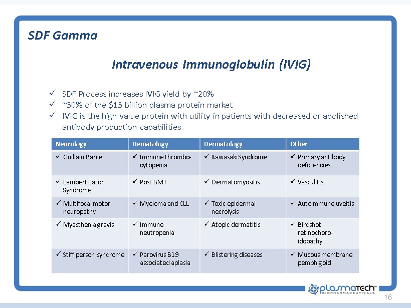 SDF Gamma 16 Neurology Hematology Dermatology Other x Guillain Barre x Immune thrombo - cytopenia x Kawasaki Syndrome x Primary antibody deficiencies x Lambert Eaton Syndrome x Post BMT x Dermatomyositis x Vasculitis x Multifocal motor neuropathy x Myeloma and CLL x Toxic epidermal necrolysis x Autoimmune uveitis x Myasthenia gravis x Immune neutropenia x Atopic dermatitis x Birdshot retinochoro - idopathy x Stiff person syndrome x Parovirus B19 associated aplasia x Blistering diseases x Mucous membrane pemphigoid x SDF Process increases IVIG yield by ~20 % x ~50% of the $15 billion plasma protein market x IVIG is the high value protein with utility in patients with decreased or abolished antibody production capabilities Intravenous Immunoglobulin (IVIG)