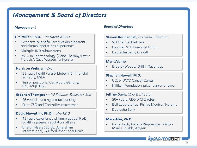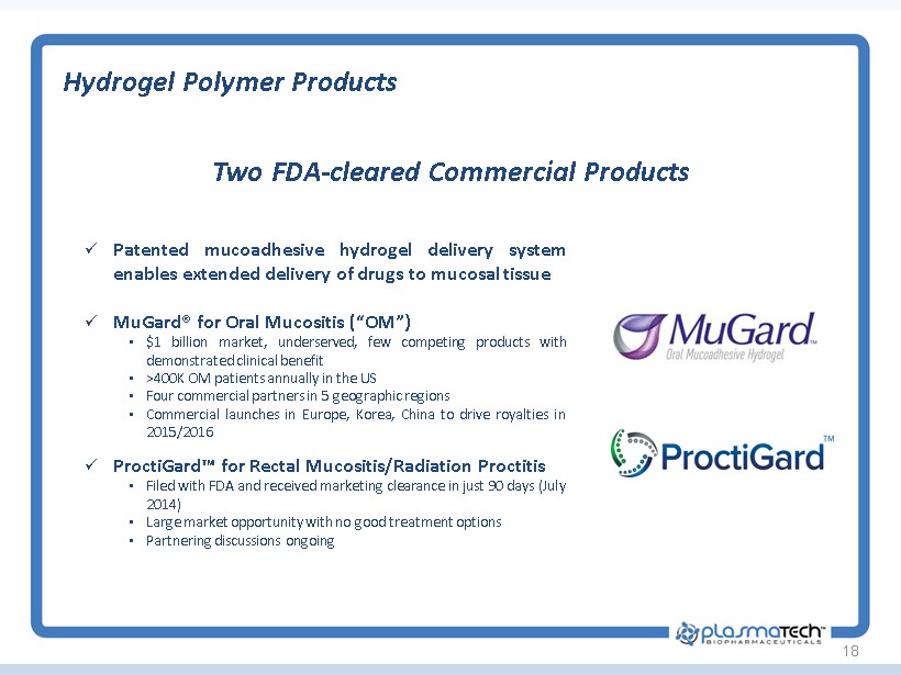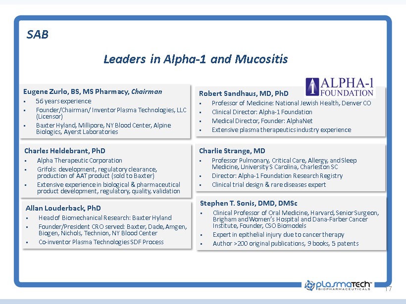 Leaders in Alpha - 1 and Mucositis 17 Eugene Zurlo, BS, MS Pharmacy, Chairman ▪ 56 years experience ▪ Founder/Chairman/ Inventor Plasma Technologies, LLC (Licensor) ▪ Baxter Hyland, Millipore, NY Blood Center, Alpine Biologics, Ayerst Laboratories Charlie Strange, MD ▪ Professor Pulmonary, Critical Care, Allergy, and Sleep Medicine, University S Carolina, Charleston SC ▪ Director: Alpha - 1 Foundation Research Registry ▪ Clinical trial design & rare diseases expert Robert Sandhaus, MD, PhD ▪ Professor of Medicine: National Jewish Health, Denver CO ▪ Clinical Director: Alpha - 1 Foundation ▪ Medical Director, Founder: AlphaNet ▪ Extensive plasma therapeutics industry experience Charles Heldebrant, PhD ▪ Alpha Therapeutic Corporation ▪ Grifols: development, regulatory clearance, production of AAT product (sold to Baxter) ▪ Extensive experience in biological & pharmaceutical product development, regulatory, quality, validation Stephen T. Sonis, DMD, DMSc ▪ Clinical Professor of Oral Medicine, Harvard, Senior Surgeon, Brigham and Women’s Hospital and Dana - Farber Cancer Institute, Founder, CSO Biomodels ▪ Expert in epithelial injury due to cancer therapy ▪ Author >200 original publications, 9 books, 5 patents Allan Louderback, PhD ▪ Head of Biomechanical Research: Baxter Hyland ▪ Founder/President CRO served: Baxter, Dade, Amgen, Biogen, Nichols, Technion, NY Blood Center ▪ Co - inventor Plasma Technologies SDF Process SAB