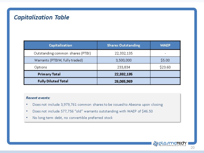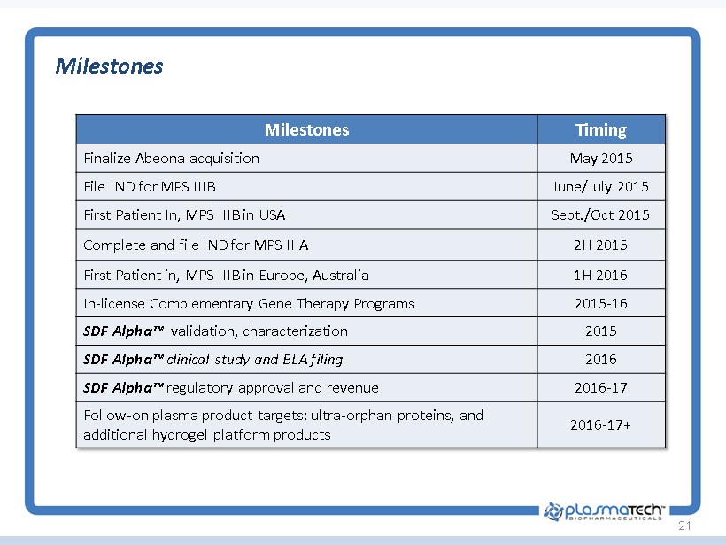 Recent events: • Does not include 3,979,761 common shares to be issued to Abeona upon closing • Does not include 577,756 “old” warrants outstanding with WAEP of $46.50 • No long term debt, no convertible preferred stock Capitalization Table 20 Capitalization Shares Outstanding WAEP Outstanding common shares (PTBI) 22,332,135 - Warrants (PTBIW, fully traded) 3,500,000 $5.00 Options 233,834 $23.60 Primary Total 22,332,135 Fully Diluted Total 26,065,969