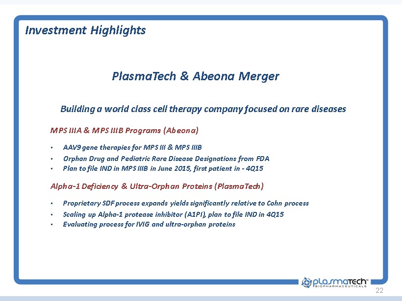 Milestones 21 Milestones Timing Finalize Abeona acquisition May 2015 File IND for MPS IIIB June/July 2015 First Patient In, MPS IIIB in USA Sept./Oct 2015 Complete and file IND for MPS IIIA 2H 2015 First Patient in, MPS IIIB in Europe, Australia 1H 2016 In - license Complementary Gene Therapy Programs 2015 - 16 SDF Alpha™ validation, characterization 2015 SDF Alpha™ clinical study and BLA filing 2016 SDF Alpha™ regulatory approval and revenue 2016 - 17 Follow - on plasma product targets: ultra - orphan proteins, and additional hydrogel platform products 2016 - 17+