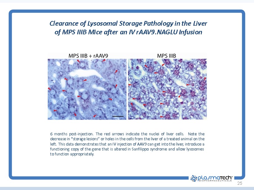25 Clearance of Lysosomal Storage Pathology in the Liver of MPS IIIB Mice after an IV rAAV9.NAGLU Infusion 6 months post - injection . The red arrows indicate the nuclei of liver cells . Note the decrease in “storage lesions” or holes in the cells from the liver of a treated animal on the left . This data demonstrates that an IV injection of AAV 9 can get into the liver, introduce a functioning copy of the gene that is altered in Sanfilippo syndrome and allow lysosomes to function appropriately .