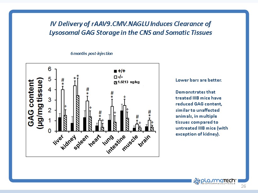 1.5E13 vg/kg 26 IV Delivery of rAAV9.CMV.NAGLU Induces Clearance of Lysosomal GAG Storage in the CNS and Somatic Tissues 6 months post - injection Lower bars are better. Demonstrates that treated IIIB mice have reduced GAG content, similar to unaffected animals, in multiple tissues compared to untreated IIIB mice (with exception of kidney).