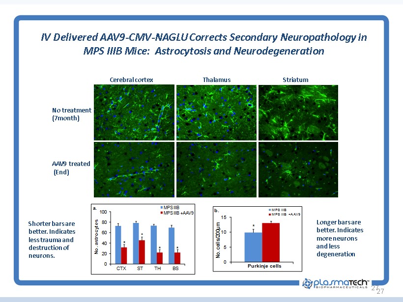 27 IV Delivered AAV9 - CMV - NAGLU Corrects Secondary Neuropathology in MPS IIIB Mice: Astrocytosis and Neurodegeneration Cerebral cortex Thalamus Striatum No treatment ( 7 month) AAV 9 treated (End) * * * * 0 20 40 60 80 100 No. astrocytes CTX ST TH BS a. MPS IIIB MPS IIIB +AAV9 * 0 5 10 15 No. cells/200 μ m Purkinje cells b. MPS IIIB MPS IIIB +AAV9 Shorter bars are better. Indicates less trauma and destruction of neurons. Longer bars are better. Indicates more neurons and less degeneration 27