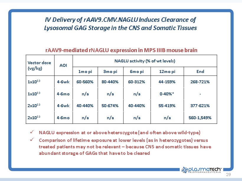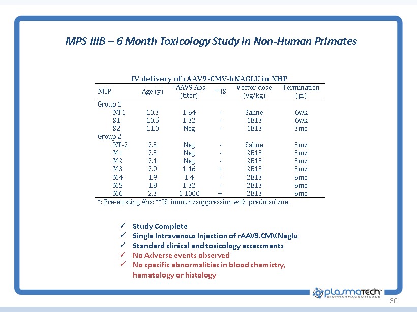 29 IV Delivery of rAAV9.CMV.NAGLU Induces Clearance of Lysosomal GAG Storage in the CNS and Somatic Tissues rAAV9 - mediated rNAGLU expression in MPS IIIB mouse brain Vector dose (vg/kg) AOI NAGLU activity (% of wt levels) 1mo pi 3mo pi 6mo pi 12mo pi End 1x10 13 4 - 6wk 60 - 560% 80 - 440% 60 - 312% 44 - 159% 268 - 721% 1x10 13 4 - 6mo n/a n/a n/a 0 - 40%* - 2x10 13 4 - 6wk 40 - 440% 50 - 674% 40 - 440% 55 - 419% 377 - 621% 2x10 13 4 - 6mo n/a n/a n/a n/a 560 - 1,549% x NAGLU expression at or above heterozygote (and often above wild - type) x Comparison of lifetime exposure at lower levels (as in heterozygotes) versus treated patients may not be relevant – because CNS and somatic tissues have abundant storage of GAGs that have to be cleared