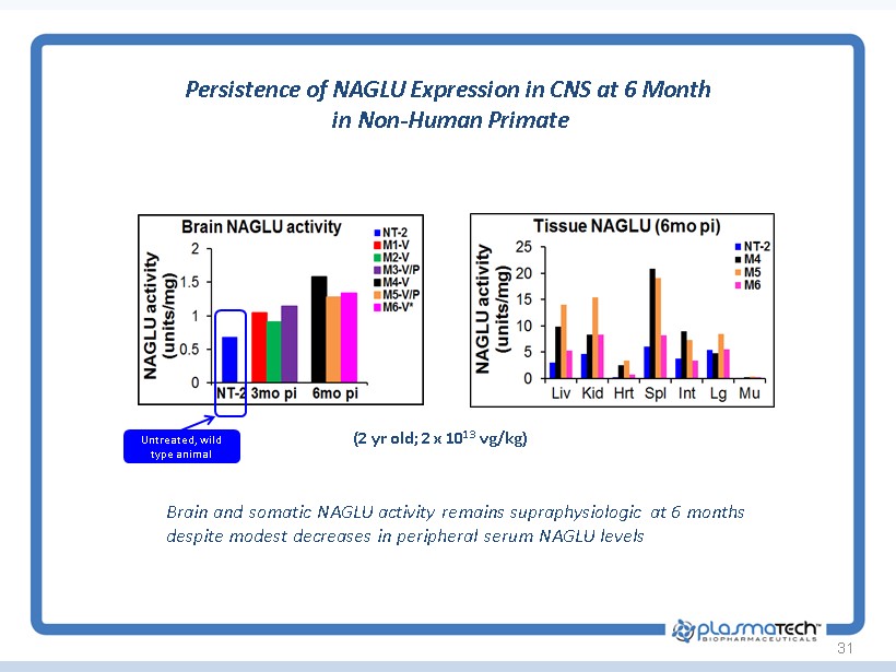 30 MPS IIIB – 6 Month Toxicology Study in Non - Human Primates IV delivery of rAAV9-CMV-hNAGLU in NHP NHP Age (y) *AAV9 Abs (titer) **IS Vector dose (vg/kg) Termination (pi) Group 1 NT1 10.3 1:64 - Saline 6wk S1 10.5 1:32 - 1E13 6wk S2 11.0 Neg - 1E13 3mo Group 2 NT-2 2.3 Neg - Saline 3mo M1 2.3 Neg - 2E13 3mo M2 2.1 Neg - 2E13 3mo M3 2.0 1:16 + 2E13 3mo M4 1.9 1:4 - 2E13 6mo M5 1.8 1:32 - 2E13 6mo M6 2.3 1:1000 + 2E13 6mo *: Pre-existing Abs; **IS: immunosuppression with prednisolone. x Study Complete x Single Intravenous Injection of rAAV9.CMV.Naglu x Standard clinical and toxicology assessments x No Adverse events observed x No specific abnormalities in blood chemistry, hematology or histology