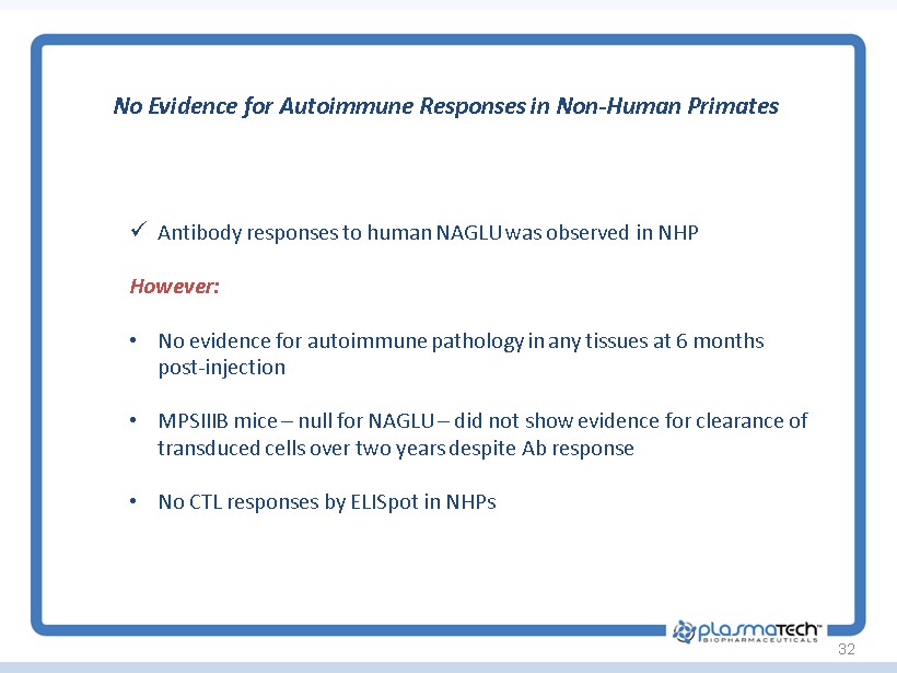 32 No Evidence for Autoimmune Responses in Non - Human Primates x Antibody responses to human NAGLU was observed in NHP However : • No evidence for autoimmune pathology in any tissues at 6 months post - injection • MPSIIIB mice – null for NAGLU – did not show evidence for clearance of transduced cells over two years despite Ab response • No CTL responses by ELISpot in NHPs