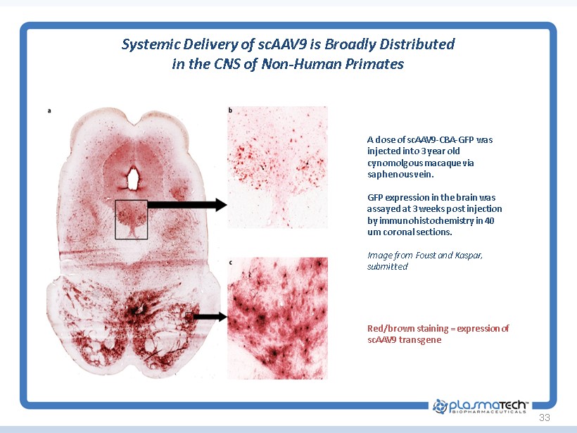 33 Systemic Delivery of scAAV9 is Broadly Distributed in the CNS of Non - Human Primates A dose of scAAV9 - CBA - GFP was injected into 3 year old cynomolgous macaque via saphenous vein. GFP expression in the brain was assayed at 3 weeks post injection by immunohistochemistry in 40 um coronal sections. Image from Foust and Kaspar , submitted Red/brown staining = expression of scAAV9 transgene
