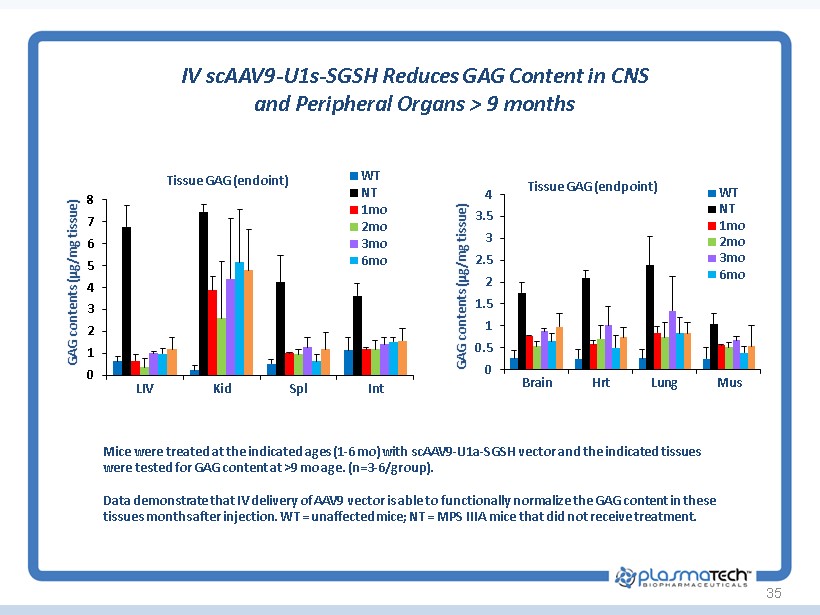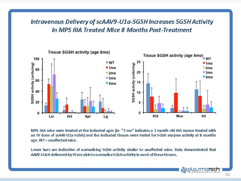 34 Intravenous Delivery of scAAV9 - U1a - SGSH Increases SGSH Activity In MPS IIIA Treated Mice 8 Months Post - Treatment MPS IIIA mice were treated at the indicated ages ( ie - “ 3 mo ” indicates a 3 month old IIIA mouse treated with an IV dose of scAAV - U 1 a - SGSH) and the indicated tissues were tested for SGSH enzyme activity at 8 months age . WT = unaffected mice . Lower bars are indicative of normalizing SGSH activity similar to unaffected mice . Data demonstrated that AAV 9 - SGSH delivered by IV are able to normalize SGSH activity in most of these tissues .