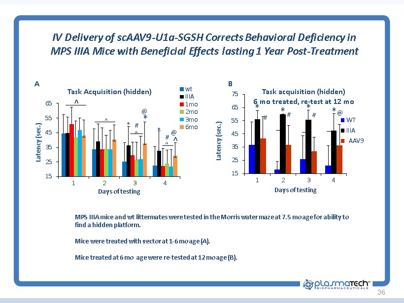 36 IV Delivery of scAAV9 - U1a - SGSH Corrects Behavioral Deficiency in MPS IIIA Mice with Beneficial Effects lasting 1 Year Post - Treatment ^ ^ * * ^ # @ @ # ^ * ^ 15 25 35 45 55 65 1 2 3 4 Latency (sec.) Days of testing Task Acquisition (hidden ) wt IIIA 1mo 2mo 3mo 6mo # # # @ * * * * 15 25 35 45 55 65 75 1 2 3 4 Latency (sec.) Days of testing Task acquisition (hidden) 6 mo treated, re - test at 12 mo WT IIIA 5E12 A B AAV9 MPS IIIA mice and wt littermates were tested in the Morris water maze at 7.5 mo age for ability to find a hidden platform. Mice were treated with vector at 1 - 6 mo age (A). Mice treated at 6 mo age were re - tested at 12 mo age (B).