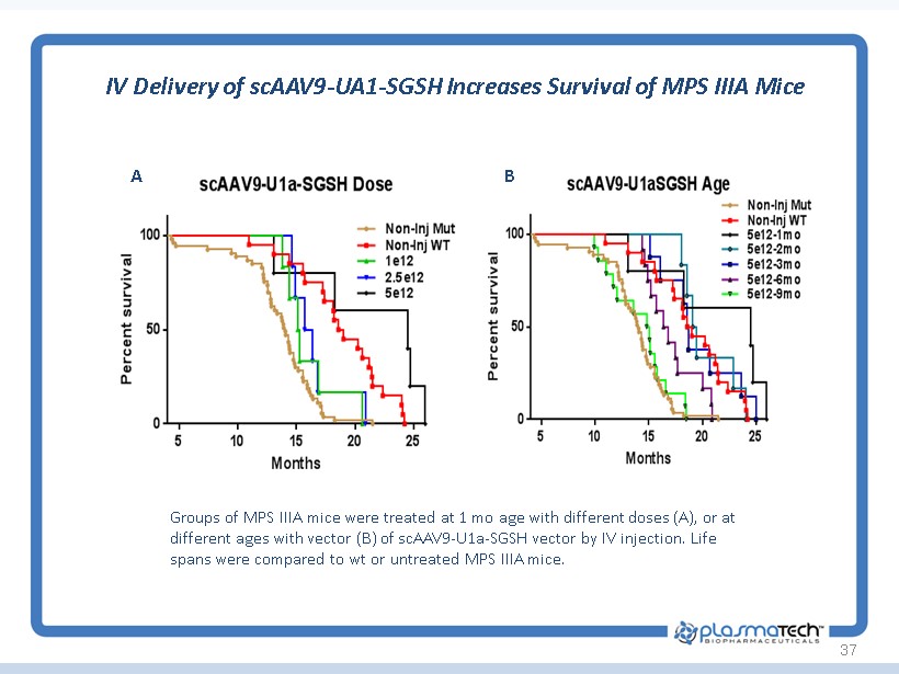 37 IV Delivery of scAAV9 - UA1 - SGSH Increases Survival of MPS IIIA Mice Groups of MPS IIIA mice were treated at 1 mo age with different doses (A), or at different ages with vector (B) of scAAV9 - U1a - SGSH vector by IV injection. Life spans were compared to wt or untreated MPS IIIA mice. A B