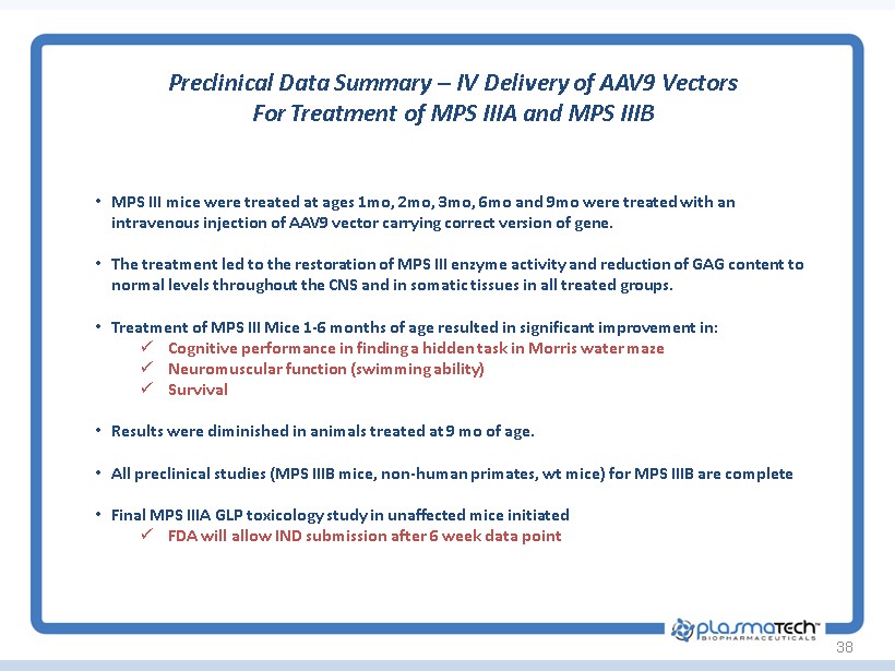 38 Preclinical Data Summary – IV Delivery of AAV9 Vectors For Treatment of MPS IIIA and MPS IIIB • MPS III mice were treated at ages 1mo, 2mo, 3mo, 6mo and 9mo were treated with an intravenous injection of AAV9 vector carrying correct version of gene. • The treatment led to the restoration of MPS III enzyme activity and reduction of GAG content to normal levels throughout the CNS and in somatic tissues in all treated groups. • Treatment of MPS III Mice 1 - 6 months of age resulted in significant improvement in: x Cognitive performance in finding a hidden task in Morris water maze x Neuromuscular function (swimming ability) x Survival • Results were diminished in animals treated at 9 mo of age. • All preclinical studies (MPS IIIB mice, non - human primates, wt mice) for MPS IIIB are complete • Final MPS IIIA GLP toxicology study in unaffected mice initiated x FDA will allow IND submission after 6 week data point