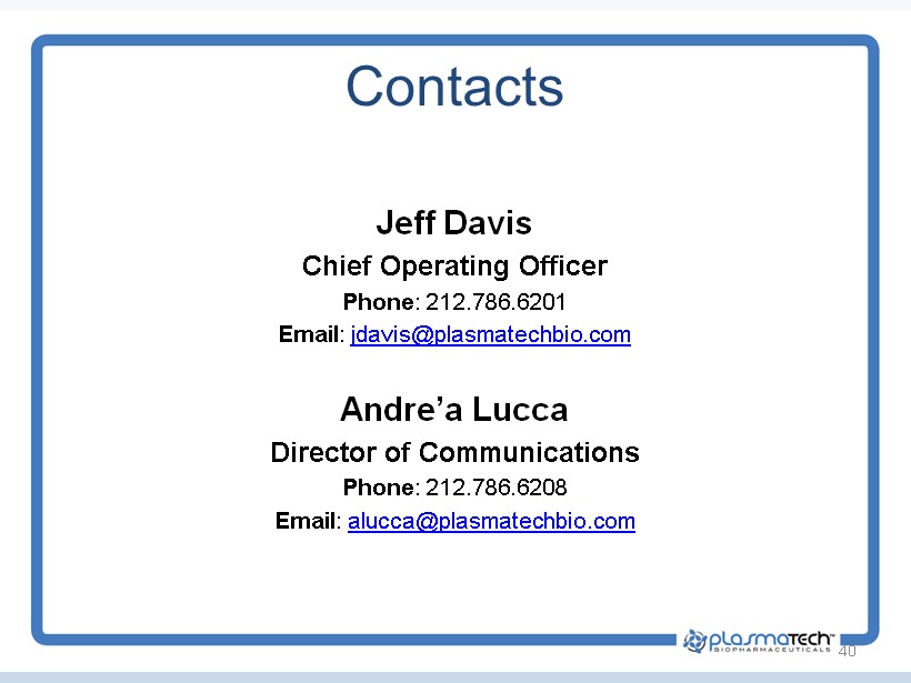 Contacts Jeff Davis Chief Operating Officer Phone : 212.786.6201 Email : jdavis@plasmatechbio.com Andre’a Lucca Director of Communications Phone : 212.786.6208 Email : alucca@plasmatechbio.com 40