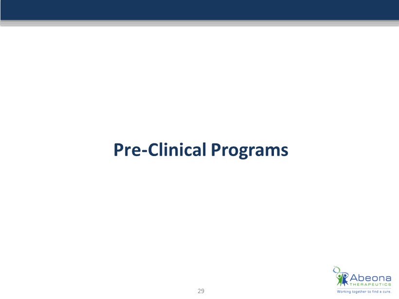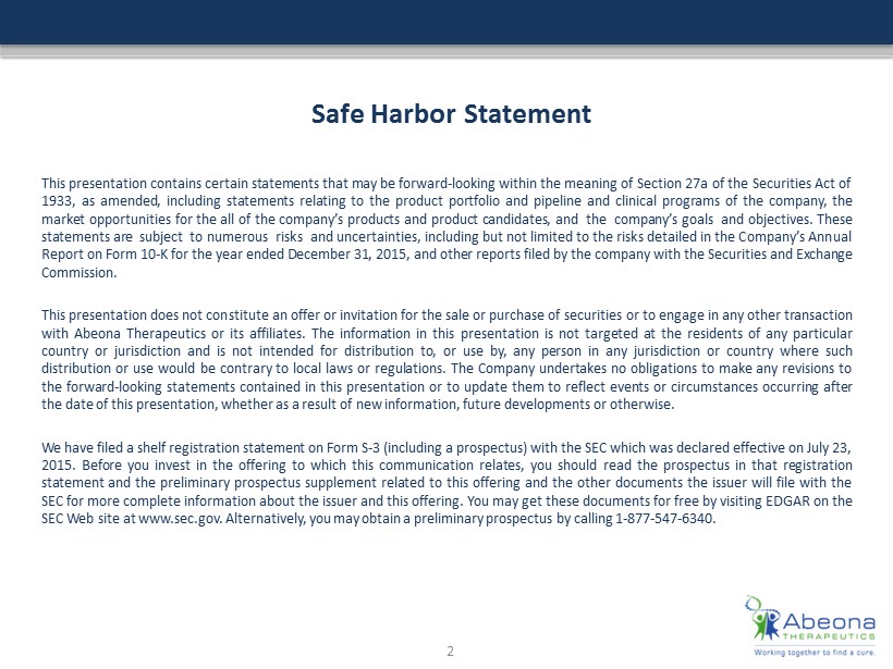 Safe Harbor Statement This presentation contains certain statements that may be forward - looking within the meaning of Section 27 a of the Securities Act of 1933 , as amended, including statements relating to the product portfolio and pipeline and clinical programs of the company, the market opportunities for the all of the company’s products and product candidates, and the company’s goals and objectives . These statements are subject to numerous risks and uncertainties, including but not limited to the risks detailed in the Company’s Annual Report on Form 10 - K for the year ended December 31 , 2015 , and other reports filed by the company with the Securities and Exchange Commission . This presentation does not constitute an offer or invitation for the sale or purchase of securities or to engage in any other transaction with Abeona Therapeutics or its affiliates . The information in this presentation is not targeted at the residents of any particular country or jurisdiction and is not intended for distribution to, or use by, any person in any jurisdiction or country where such distribution or use would be contrary to local laws or regulations . The Company undertakes no obligations to make any revisions to the forward - looking statements contained in this presentation or to update them to reflect events or circumstances occurring after the date of this presentation, whether as a result of new information, future developments or otherwise . We have filed a shelf registration statement on Form S - 3 (including a prospectus) with the SEC which was declared effective on July 23 , 2015 . Before you invest in the offering to which this communication relates, you should read the prospectus in that registration statement and the preliminary prospectus supplement related to this offering and the other documents the issuer will file with the SEC for more complete information about the issuer and this offering . You may get these documents for free by visiting EDGAR on the SEC Web site at www . sec . gov . Alternatively, you may obtain a preliminary prospectus by calling 1 - 877 - 547 - 6340 . 2