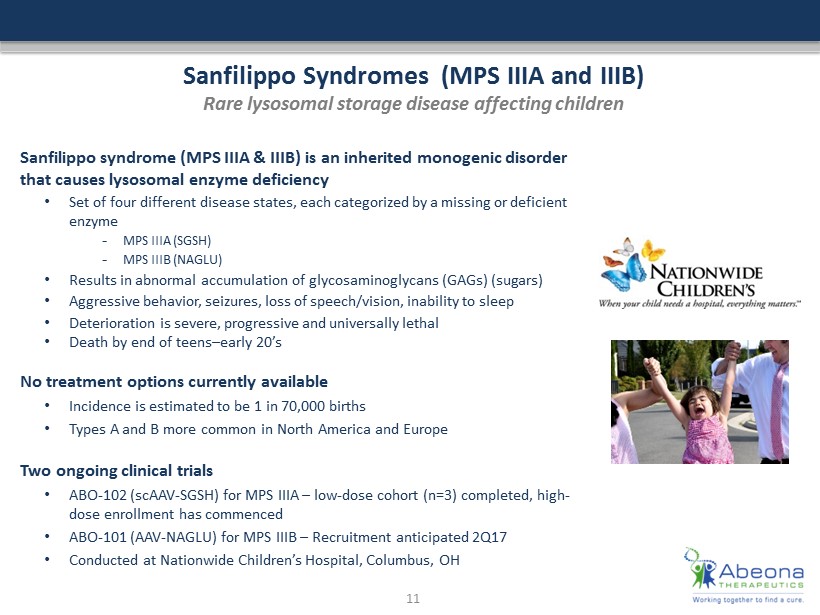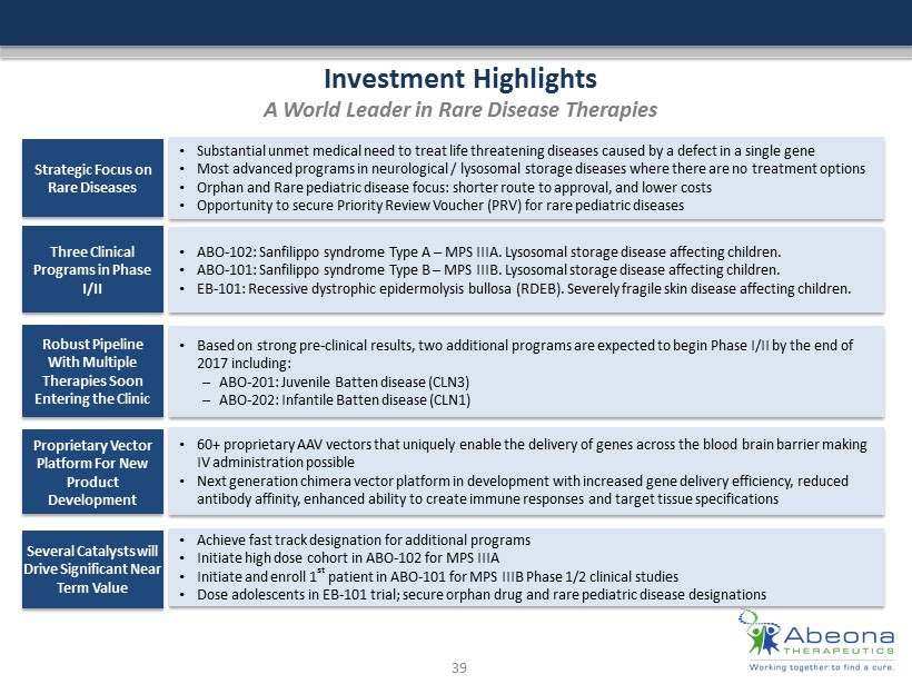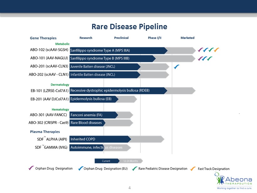 Investment Highlights A World Leader in Rare Disease Therapies Strategic Focus on Rare Diseases • Substantial unmet medical need to treat life threatening diseases caused by a defect in a single gene • Most advanced programs in neurological / lysosomal storage diseases where there are no treatment options • Orphan and Rare pediatric disease focus: shorter route to approval, and lower costs • Opportunity to secure Priority Review Voucher (PRV) for rare pediatric diseases Three Clinical Programs in Phase I/II • ABO - 102: Sanfilippo syndrome Type A – MPS IIIA. Lysosomal storage disease affecting children. • ABO - 101 : Sanfilippo syndrome Type B – MPS IIIB. Lysosomal storage disease affecting children. • EB - 101 : Recessive dystrophic epidermolysis bullosa (RDEB ). Severely fragile skin disease affecting children. Robust Pipeline With Multiple Therapies Soon Entering the Clinic • Based on strong pre - clinical results, two additional programs are expected to begin Phase I/II by the end of 2017 including: – ABO - 201: Juvenile Batten disease (CLN3) – ABO - 202: Infantile Batten disease (CLN1) Proprietary Vector Platform For New Product Development • 60+ proprietary AAV vectors that uniquely enable the delivery of genes across the blood brain barrier making IV administration possible • Next generation chimera vector platform in development with increased gene delivery efficiency, reduced antibody affinity, enhanced ability to create immune responses and target tissue specifications Several Catalysts will Drive Significant Near Term Value • Achieve fast track designation for additional programs • Initiate high dose cohort in ABO - 102 for MPS IIIA • Initiate and enroll 1 st patient in ABO - 101 for MPS IIIB Phase 1/2 clinical studies • Dose adolescents in EB - 101 trial; secure orphan drug and rare pediatric disease designations 3