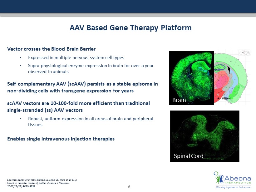 AAV Based Gene Therapy Platform Vector crosses the Blood Brain Barrier • Expressed in multiple nervous system cell types • Supra - physiological enzyme expression in brain for over a year observed in animals Self - complementary AAV (scAAV) persists as a stable episome in non - dividing cells with transgene expression for years scAAV vectors are 10 - 100 - fold more efficient than traditional single - stranded ( ss ) AAV vectors • Robust, uniform expression in all areas of brain and peripheral tissues Enables single intravenous injection therapies Sources: Keilan et al lab.; Eliason SL, Stein CS, Mao Q, et al. A knock - in reporter model of Batten disease. J Neurosci . 2007;27(37):9826 - 9834. Spinal Cord Brain 6