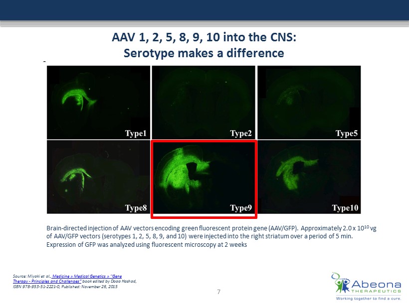 AAV 1, 2, 5, 8, 9, 10 into the CNS: Serotype makes a difference Brain - directed injection of AAV vectors encoding green fluorescent protein gene (AAV/GFP). Approximately 2.0 x 10 10 vg of AAV/GFP vectors (serotypes 1, 2, 5, 8, 9, and 10) were injected into the right striatum over a period of 5 min. Expression of GFP was analyzed using fluorescent microscopy at 2 weeks Source: Miyaki et al., Medicine » Medical Genetics » "Gene Therapy - Principles and Challenges “ book edited by Doaa Hashad, ISBN 978 - ### - ## - #### - 0, Published: November 26, 2015 7