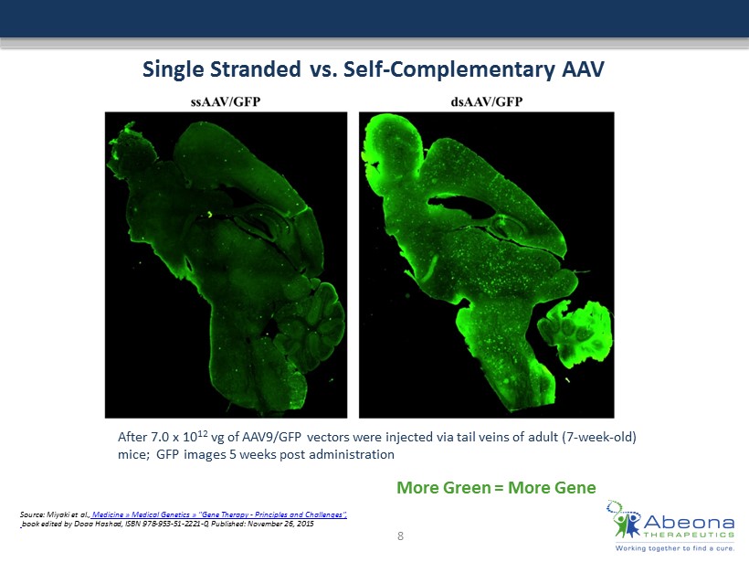 Single Stranded vs. Self - Complementary AAV Source: Miyaki et al., Medicine » Medical Genetics » "Gene Therapy - Principles and Challenges" , book edited by Doaa Hashad, ISBN 978 - ### - ## - #### - 0, Published: November 26, 2015 After 7.0 x 10 12 vg of AAV9/GFP vectors were injected via tail veins of adult (7 - week - old) mice ; GFP images 5 weeks post administration 8 More Green = More Gene