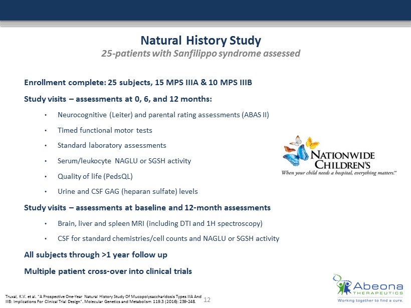 Sanfilippo Syndromes (MPS IIIA and IIIB) Rare lysosomal storage disease affecting children Sanfilippo syndrome (MPS IIIA & IIIB) is an inherited monogenic disorder that causes lysosomal enzyme deficiency • Set of four different disease states, each categorized by a missing or deficient enzyme - MPS IIIA (SGSH) - MPS IIIB (NAGLU) • Results in abnormal accumulation of glycosaminoglycans (GAGs) (sugars) • Aggressive behavior, seizures, loss of speech/vision, inability to sleep • Deterioration is severe, progressive and universally lethal • Death by end of teens – early 20’s No treatment options currently available • Incidence is estimated to be 1 in 70,000 births • Types A and B more common in North America and Europe Two ongoing clinical trials • ABO - 102 ( scAAV - SGSH) for MPS IIIA – low - dose cohort (n=3) completed, high - dose enrollment has commenced • ABO - 101 (AAV - NAGLU) for MPS IIIB – Recruitment anticipated 2Q17 • Conducted at Nationwide Children’s Hospital, Columbus, OH 11