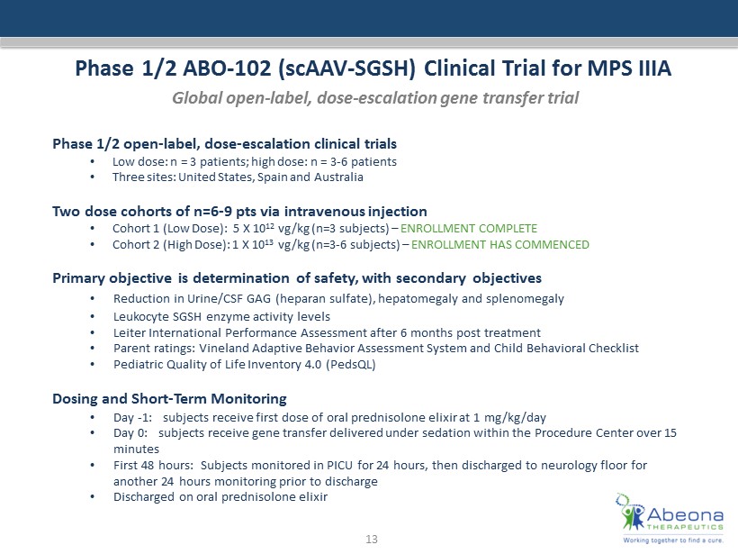 Natural History Study 25 - patients with Sanfilippo syndrome assessed Enrollment complete : 25 subjects, 15 MPS IIIA & 10 MPS IIIB Study visits – assessments at 0 , 6 , and 12 months : • Neurocognitive (Leiter) and parental rating assessments (ABAS II) • Timed functional motor tests • Standard laboratory assessments • Serum/leukocyte NAGLU or SGSH activity • Quality of life (PedsQL) • Urine and CSF GAG (heparan sulfate) levels Study visits – assessments at baseline and 12 - month assessments • Brain, liver and spleen MRI (including DTI and 1 H spectroscopy) • CSF for standard chemistries/cell counts and NAGLU or SGSH activity All subjects through > 1 year follow up Multiple patient cross - over into clinical trials 12 Truxal , K.V. et al. "A Prospective One - Year Natural History Study Of Mucopolysaccharidosis Types IIIA And IIIB: Implications For Clinical Trial Design". Molecular Genetics and Metabolism 119.3 (2016): 239 - 248.