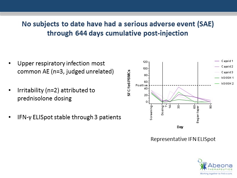 No subjects to date have had a serious adverse event (SAE ) through 644 days cumulative post - injection • Upper respiratory infection most common AE (n=3, judged unrelated) • Irritability (n=2) attributed to prednisolone dosing • IFN - γ ELISpot stable through 3 patients 0 20 40 60 80 100 120 MPS-IIIA-03 Day S F C / 1 e 6 P B M C s S c r e e n i n g D o s i n g 7 1 4 3 0 Positive Capsid 1 Capsid 2 Capsid 3 hSGSH 1 hSGSH 2 6 0 9 0 B e g a n t a p e r Representative IFN ELISpot