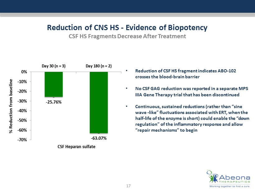 ABO - 102 Reduced Heparan Sulfate (HS) and Total Urinary GAG 0.0% - 35.2% - 51.5% - 30.7% - 34.4% -70% -60% -50% -40% -30% -20% -10% 0% Screening (n=3) Day 30 (n=3) Day 60 (n=3) Day 90 (n=3) Day 180 (n=2) % Reduction TOTAL GAG Urinary TOTAL GAG 0.0% - 57.6% - 57.6% - 44.4% -70% -60% -50% -40% -30% -20% -10% 0% Screening Day 30 (n=3) Day 60 (n=3) Day 90 (n=3) % Reduction in urinary HS Urinary HS GAG 16 Urine glycosaminoglycans (GAGs) normally decrease as a function of age among unaffected individuals