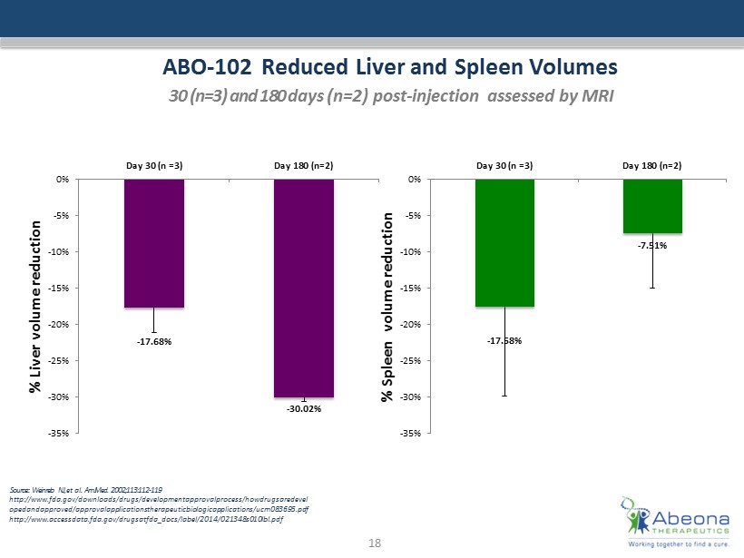 ABO - 102 Reduced Liver and Spleen Volumes 30 (n=3) and 180 d ays (n=2) post - injection a ssessed by MRI Source: : Weinreb NJ, et al. Am J Med. 2002;113:112 - 119 http:// www.fda.gov /downloads/drugs/ developmentapprovalprocess / howdrugsaredevel opedandapproved / approvalapplicationstherapeuticbiologicapplications /ucm083 695.pdf http:// www.accessdata.fda.gov / drugsatfda_docs / label /2014/021348s010lbl.pdf 18 - 17.68% - 30.02% -35% -30% -25% -20% -15% -10% -5% 0% Day 30 (n =3) Day 180 (n=2) % Liver volume reduction - 17.58% - 7.51% -35% -30% -25% -20% -15% -10% -5% 0% Day 30 (n =3) Day 180 (n=2) % Spleen volume reduction